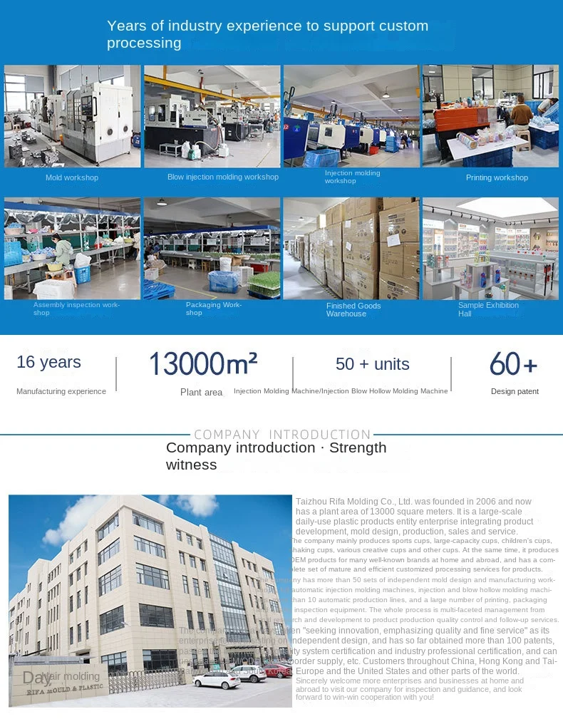 Taizhou Huangyan RIFA Mouldling Co., Ltd. is located in the home of plastic stuff,has a plant area of more than 12,000 square, is a collection of product development, manufacturing, mold design, production and sales as one of the professional plastic water bottle manufacturer.and at the same time for many well-known brands OEM production, with a complete set of mature and efficient product customization services. At present, we have established long-term and friendly cooperative relations with Miniso, Disney, Snoopy, Mouthy Monkey, Jiuyang, Garte and so on. Our company has always taken "innovation, quality, fine service" as the enterprise purpose, adhere to independent design, so far accumulated more than 100 patents, and passed the international quality system certification and industry professional certification, can undertake OEM/ODM, cross-border supply. Customers in Hong Kong, China, Japan and South Korea, Europe and America and other parts of the world. Sincerely welcome more enterprises and businesses at home and abroad to visit our company and look forward to win-win cooperation with you!